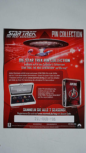 Ich zitiere einmal: " Jedes Steelbook dieser Sonderedition enthält einen exklusiven Star Trek-Pin sowie einen Sammelcode. Sammler, die alle sieben Codes haben, können mit Erscheinen der siebten Staffel bei Paramount eine Sammelbox für die Pins anfordern. Die Pins sind ca. 5 cm groß und nur über die Collectors Edition von "Star Trek: The Next Generation" auf Blu-ray Disc erhältlich."