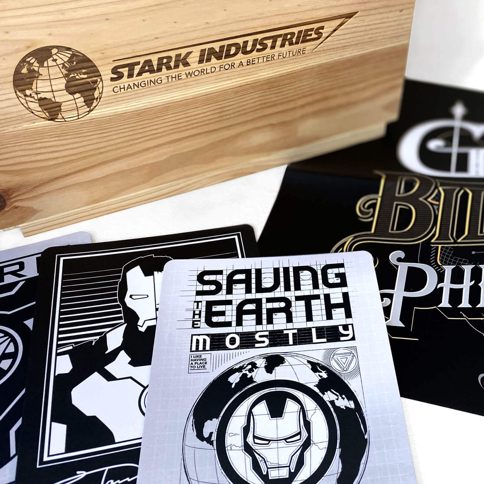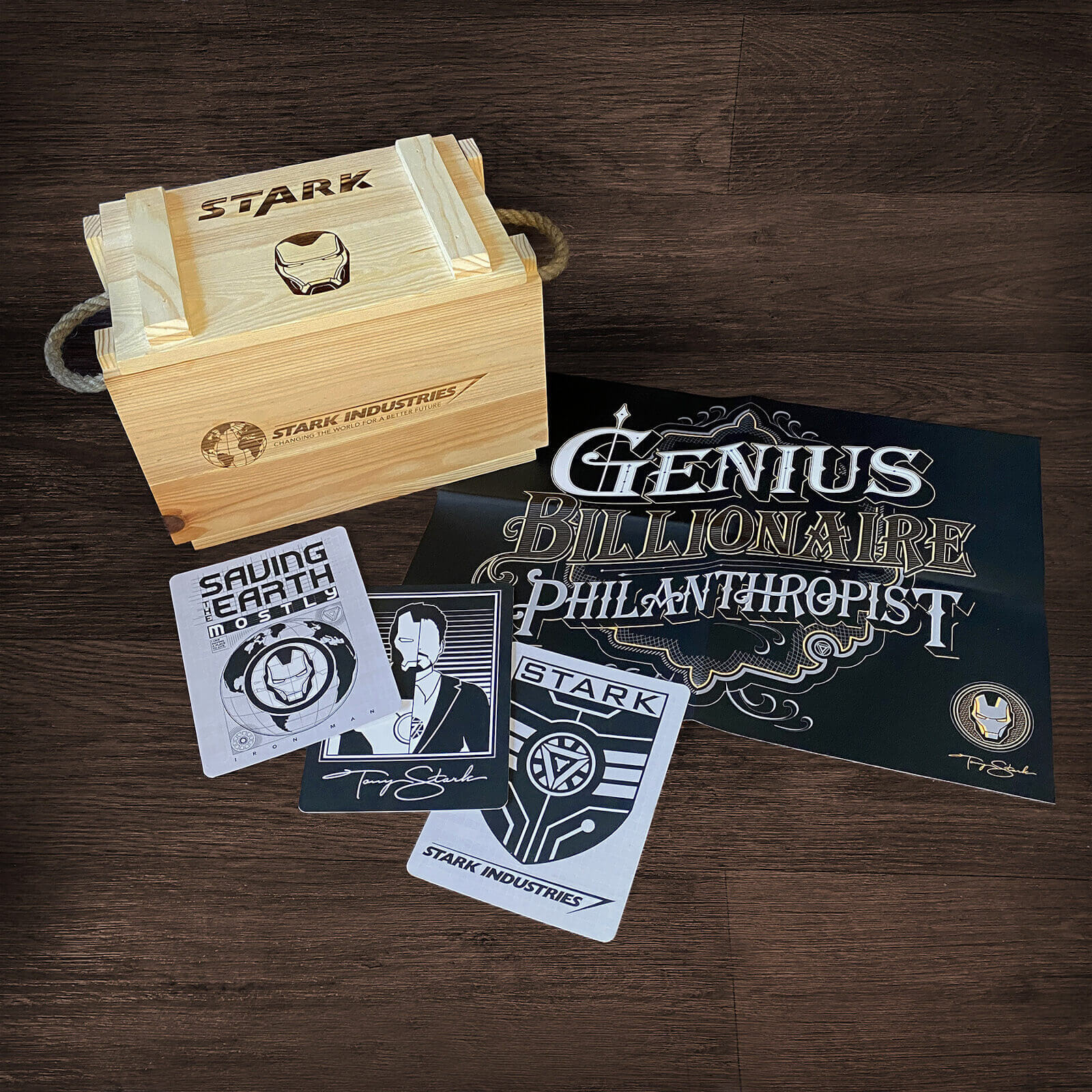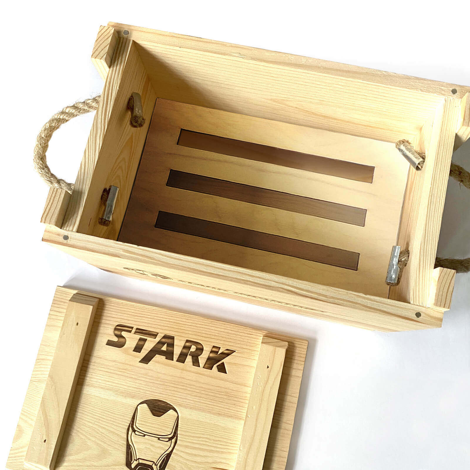 - Marvel wooden 'ammo crate' laser branded with Stark Industries corporate logos and Iron Man helmet.