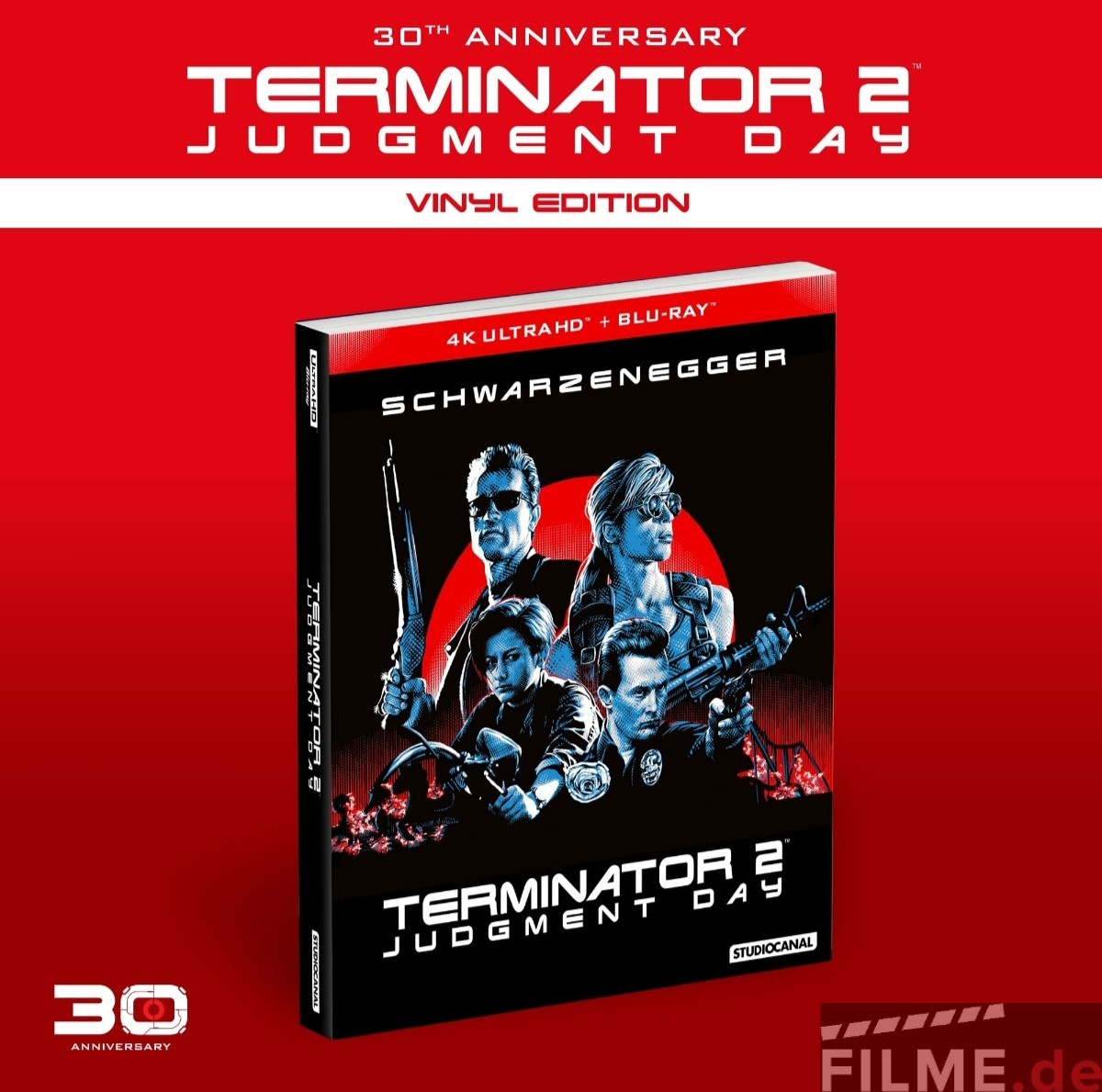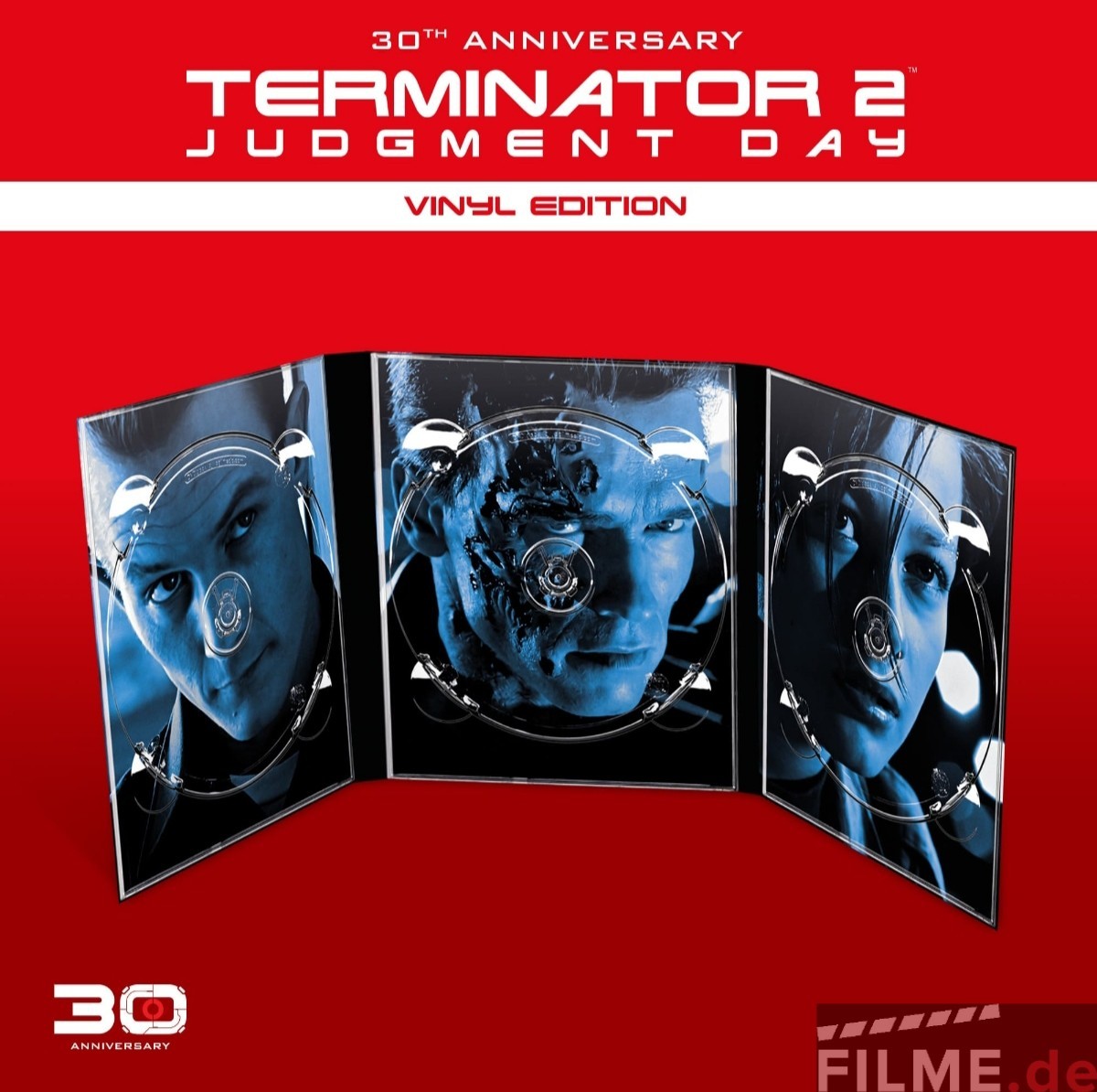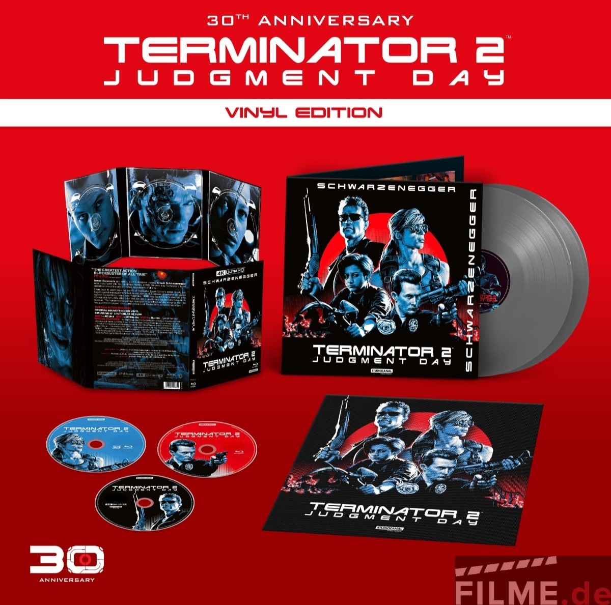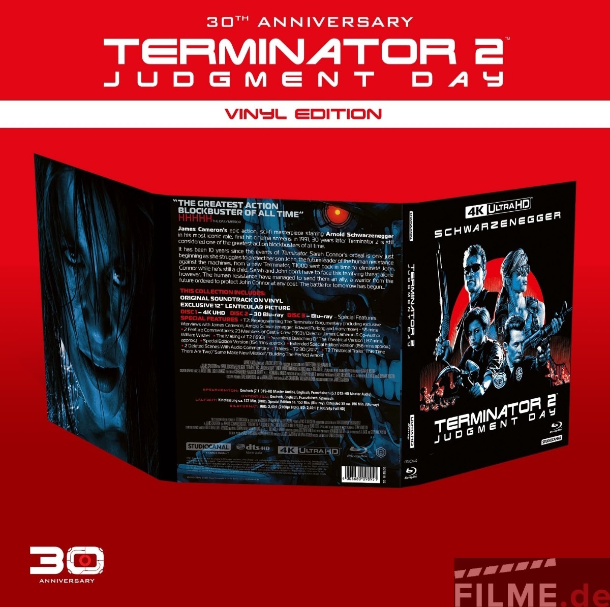 Besonderheiten: Die Limited 30th Anniversary Vinyl Edition enthält ein 3-Disc Digipak mit der Kinofassung von TERMINATOR 2 auf 4K UHD Blu-ray (ca. 137 Minuten) einer Blu-ray mit Kinofassung, dem Director’s Cut* (ca. 154 Minuten) und der Extended Special Edition* (ca. 156 Minuten), sowie einer 3D Blu-ray der Kinofassung und dem Original Filmsoundtrack auf Doppel-Vinyl in hochwertigem Gatefold-Cover und einem Lentikular-Druck des Coverartworks.