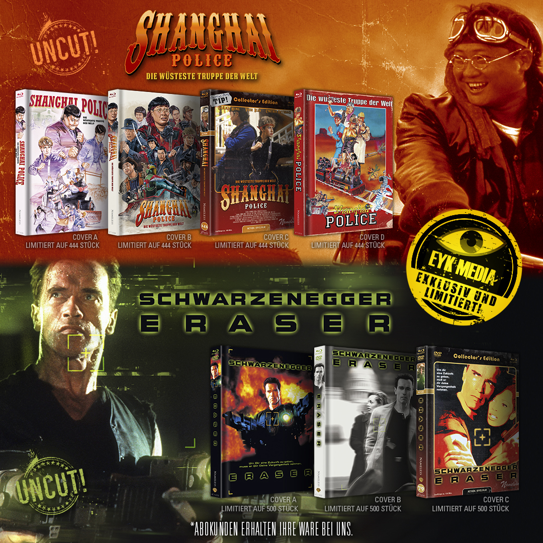 Es freut mich auch sehr, euch die Titel „ERASER“ und „SHANGHAI POLICE“ ankündigen zu dürfen. Diese schönen Nameless MB´s werden exklusiv über unseren Freund und Partner EYK-Media vertrieben. Der Vorverkauf startet am Mittwoch, dem 13.12.2023, um 18:00 Uhr und der VÖ ist am Montag, dem 18.12.2023. Alle Abonnenten erhalten ihre Ware wie gewohnt direkt über uns.