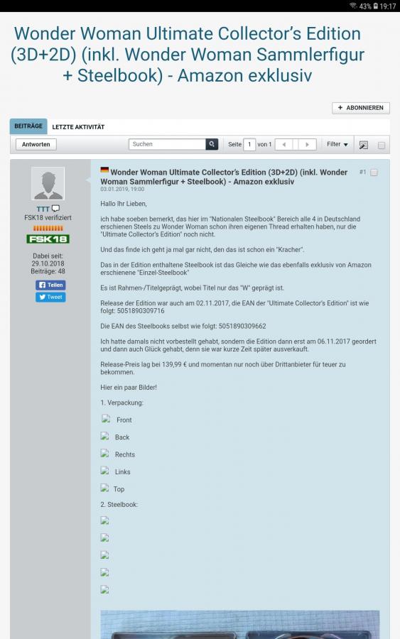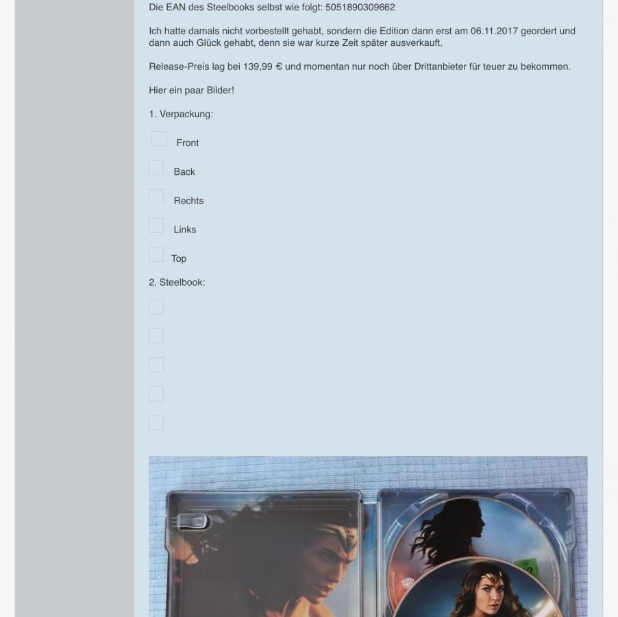 ich habe soeben bemerkt, das hier im "Nationalen Steelbook" Bereich alle 4 in Deutschland erschienen Steels zu Wonder Woman schon ihren eigenen Thread erhalten haben, nur die "Ultimate Collector’s Edition" noch nicht.